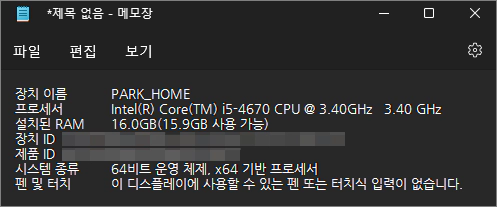 복사한 장치 사양을 텍스트 파일에 붙여 넣기를 해보니까 위와 같이 그대로 입력이 됩니다. 이렇게 내 PC 사양을 확인해야 하는 사람에게 공유를 해주세요.