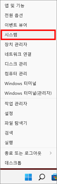 아주 간단합니다. 작업 표시줄 시작 버튼에 마우스 우클릭을 하시면 위와 같은 메뉴 화면이 열릴 거예요. 그러면 상단에 보이는 시스템을 클릭하세요.