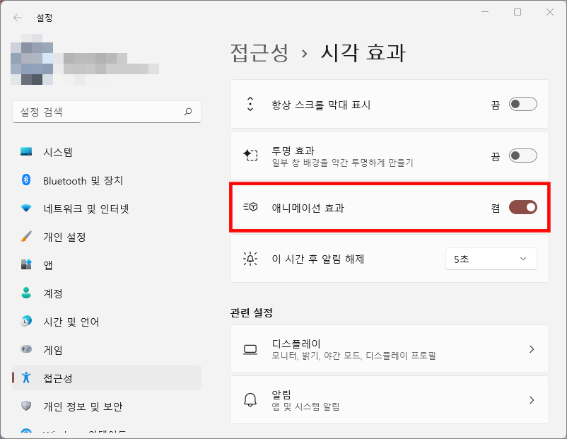 윈도우 11 애니메이션 효과 켜기 끄기 방법