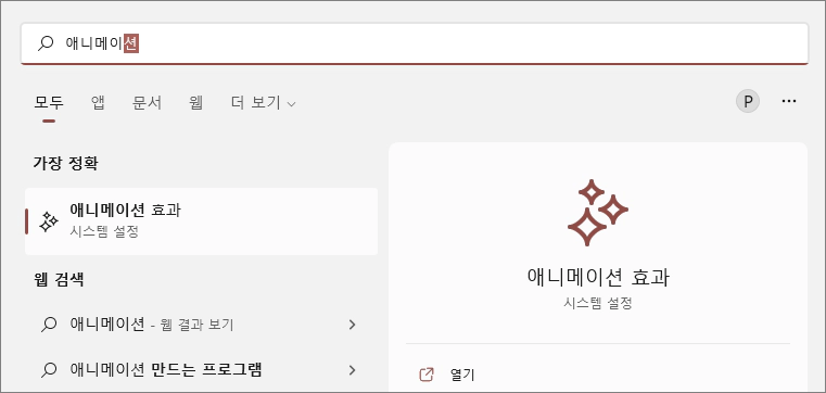 설정에서 직접 애니메이션 효과 설정이 있는 위치까지 찾아가는 방법도 있지만 간단하게 검색으로 한 번에 찾아가는 방법도 있습니다.