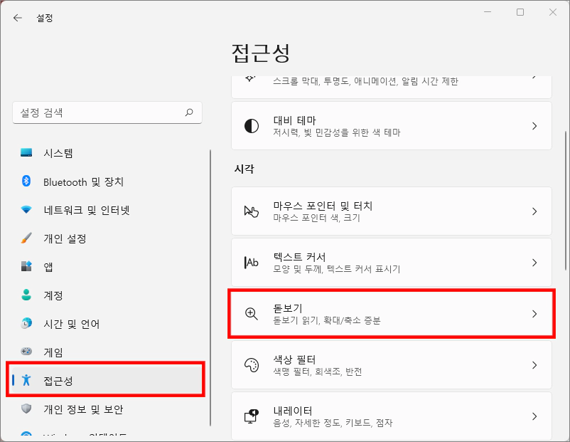 설정 창이 열렸습니다. 이제 왼쪽에서 접근성을 클릭하세요. 그리고 오른쪽에 시각 항목에서 돋보기를 클릭하면 설정 화면으로 이동할 수 있습니다.
