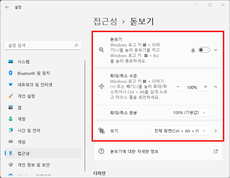 이렇게 돋보기 설정 화면으로 넘어왔습니다. 많은 설정 내용을 제공하는 것은 아니지만 그래도 화면 확대 관련된 설정은 사용자가 직접 변경할 수 있으니 필요하다면 변경해서 사용해보세요.