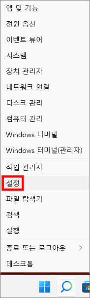 돋보기 관련 설정을 하고 싶다면 지금 알려드리는 방법으로 진행해서 설정 창을 열어보세요. 작업 표시줄 시작 버튼에 마우스 우클릭으로 메뉴 화면을 열어줍니다. 그리고 설정을 클릭하세요.